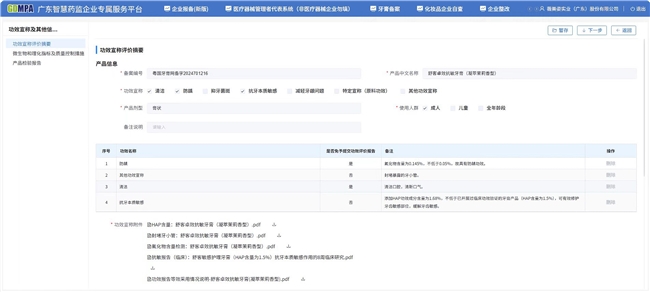 同时,备案后台还显示该产品已上传全套功效佐证材料,包括美白专项报告、7 天色阶提升测试报告、防渍报告、16 小时长效清新验证报告等消费者测试数据,以及 2 项分别涉及牙齿护理组合物、含酶制剂牙膏的发明专利证书,充分证明其功效宣称有迹可循、有据可依。其中,“清洁” 功效因符合《牙膏原料管理规定》中 “免于功效评价” 的相关要求,标注为 “免提交评价报告”,其余功效均对应专项验证材料。